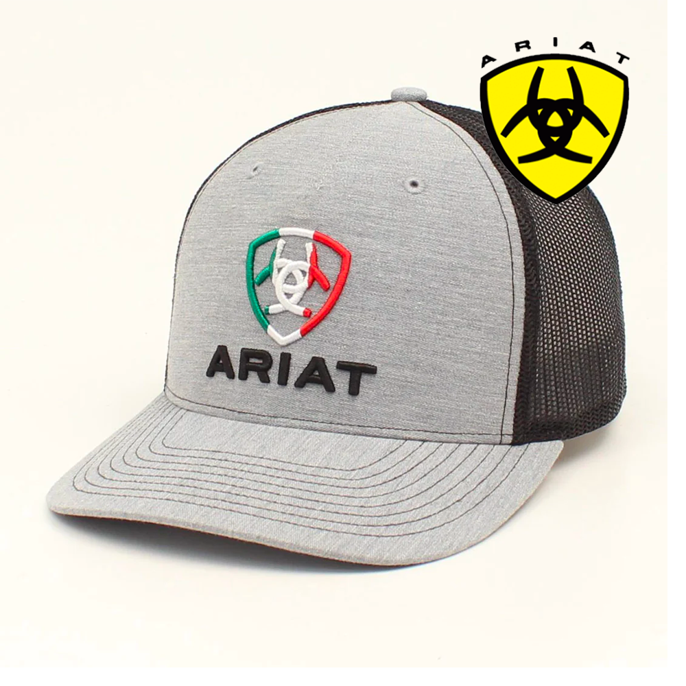 Comfy Ariat mens R112 cap by M&F Western Products. Grey front panels with Ariat shield logo in green, white, and red-the colors of the Mexican flag. Black mesh with snapback closure for a perfect fit.