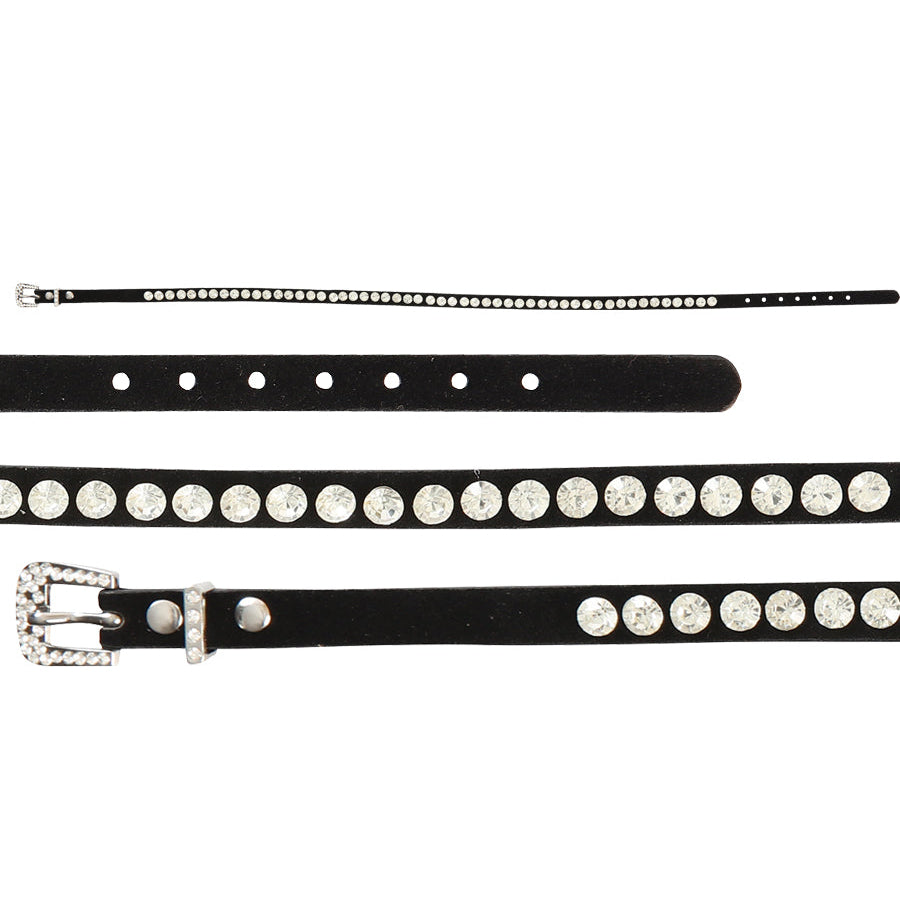 Dale un toque western a tu sombrero con esta cinta negra de piel sintética , con una hilera de grandes diamantes de imitación redondos a lo largo. Diseñada para realzar cualquier sombrero de vaquero, incluye una hebilla, presilla y puntera plateadas decorativas que realzan su clásico estilo western.