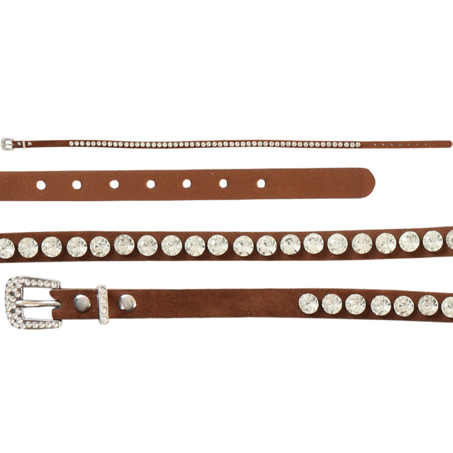 Dale un toque western a tu sombrero con esta cinta de cuero marrón , con una hilera de grandes diamantes de imitación redondos a lo largo. Diseñada para realzar cualquier sombrero vaquero, incluye una hebilla, una trabilla y un juego de puntas plateados decorativos que realzan su clásico estilo western.