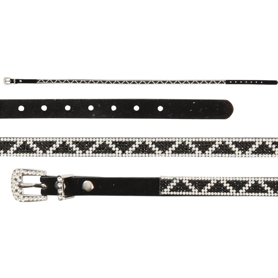 Dale un toque atrevido y elegante a tu sombrero con esta cinta negra de piel sintética , con un llamativo patrón geométrico en zigzag, hecha íntegramente con pedrería transparente y negra . La hebilla, la trabilla y la punta plateadas están completamente incrustadas con pedrería, lo que le da el toque perfecto de brillo a tu look western.