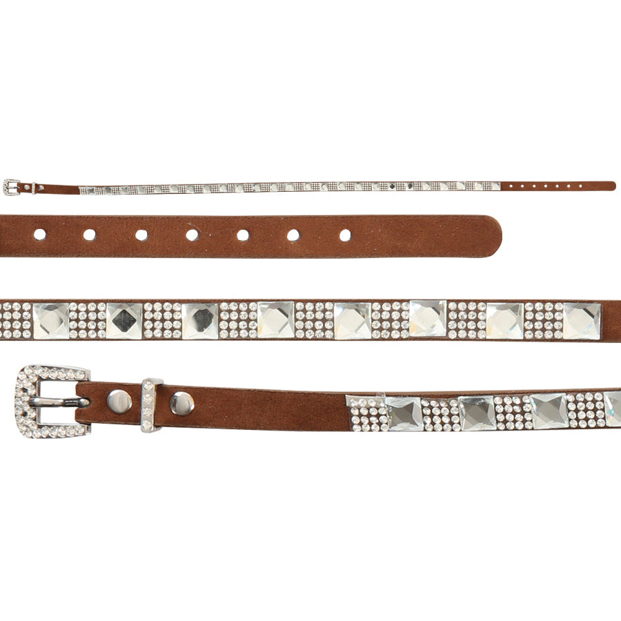 Dale un toque de brillo a tu sombrero favorito con esta cinta marrón de piel sintética , con una llamativa hilera de diamantes de imitación cuadrados bordeados por pequeños detalles de cristal para un look glamuroso de inspiración western. La cinta ajustable está rematada con una hebilla, trabilla y punta plateadas , todas adornadas con diamantes de imitación para un brillo extra.
