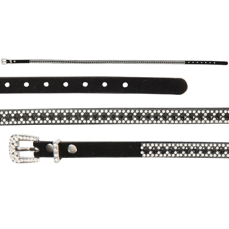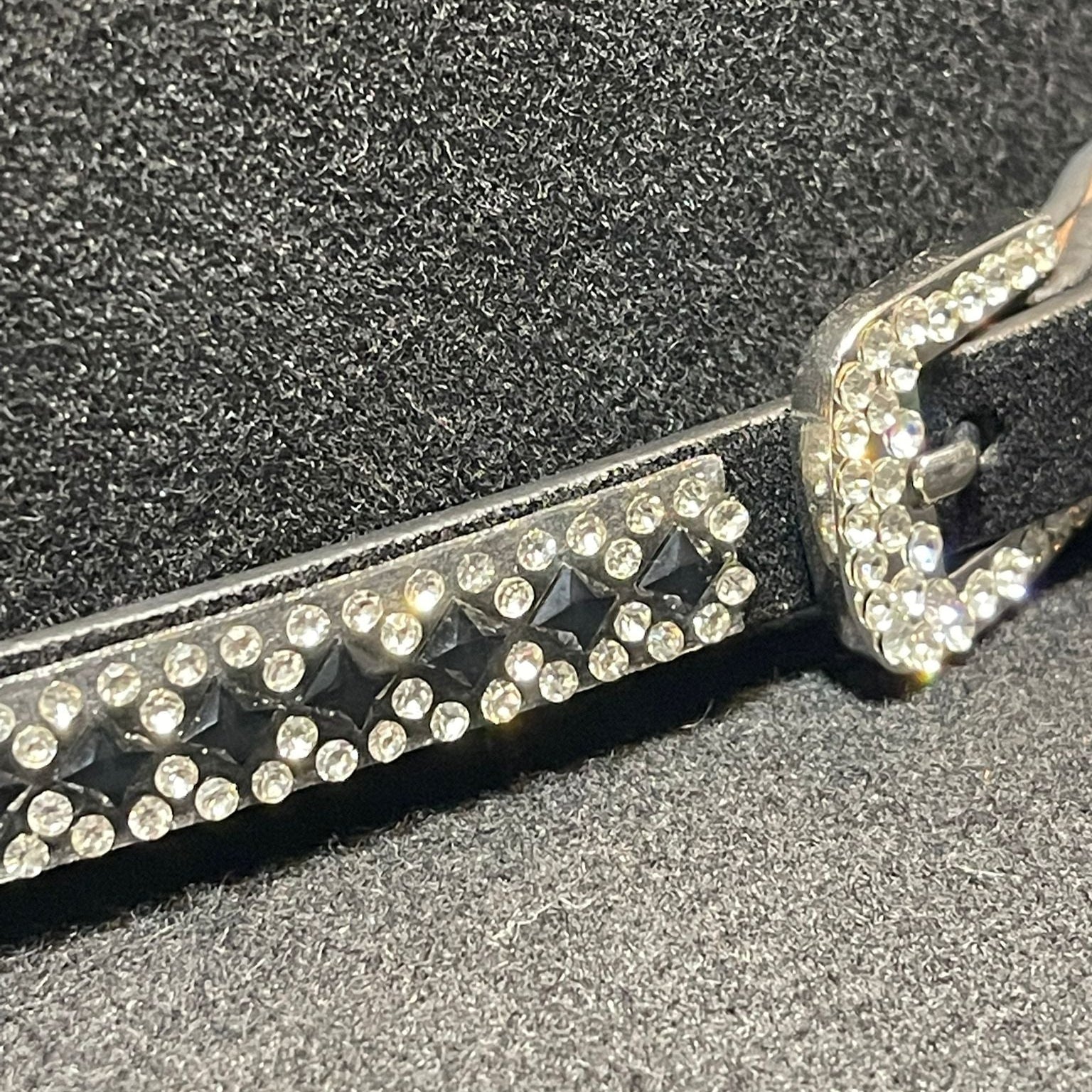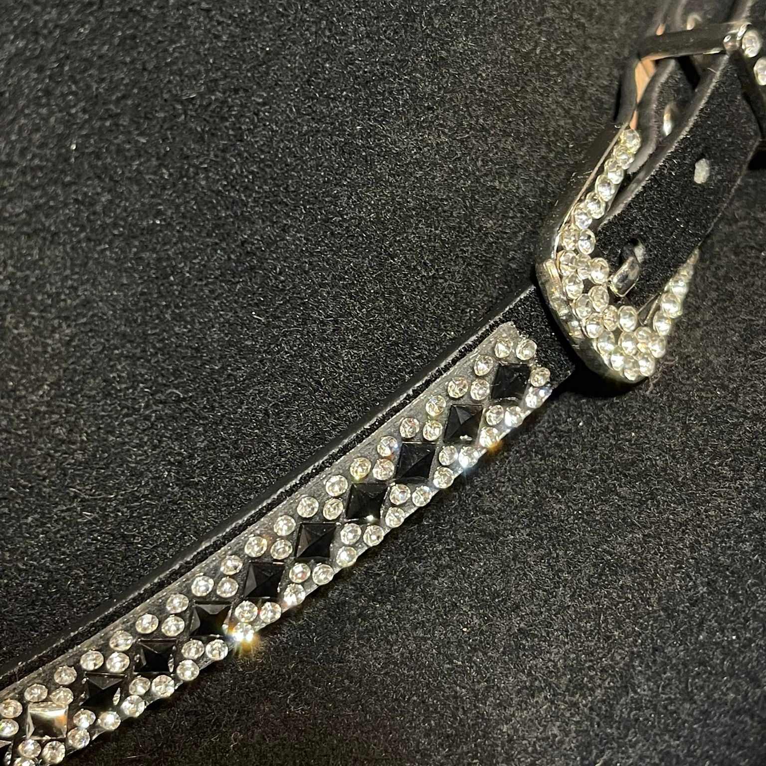 Dale un toque de estilo western a tu sombrero con esta cinta negra de ante sintético , con un vibrante diseño de diamantes de imitación rojos , acentuada con hileras de pequeños cristales transparentes . Sus tonos cálidos y su llamativo brillo la convierten en una opción elegante para las noches de rodeo o para el día a día. Con una hebilla plateada cubierta de diamantes de imitación, ofrece tanto ajuste como glamour.
