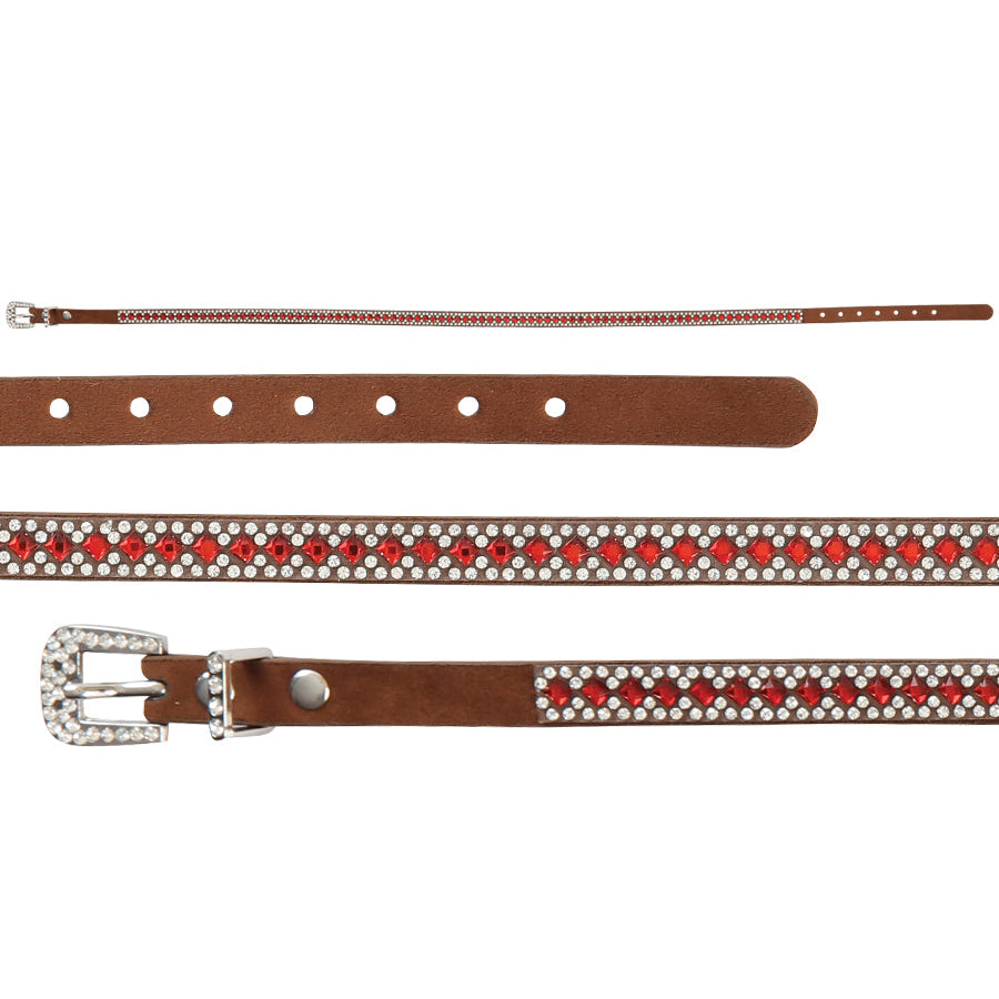 Dale un toque de estilo western a tu sombrero con esta cinta marrón de piel sintética , con un vibrante diseño de diamantes de imitación rojos , acentuado con hileras de pequeños cristales transparentes . Sus tonos cálidos y su llamativo brillo la convierten en una opción elegante para las noches de rodeo o para el día a día. Con una hebilla plateada cubierta de diamantes de imitación, ofrece tanto ajuste como glamour.
