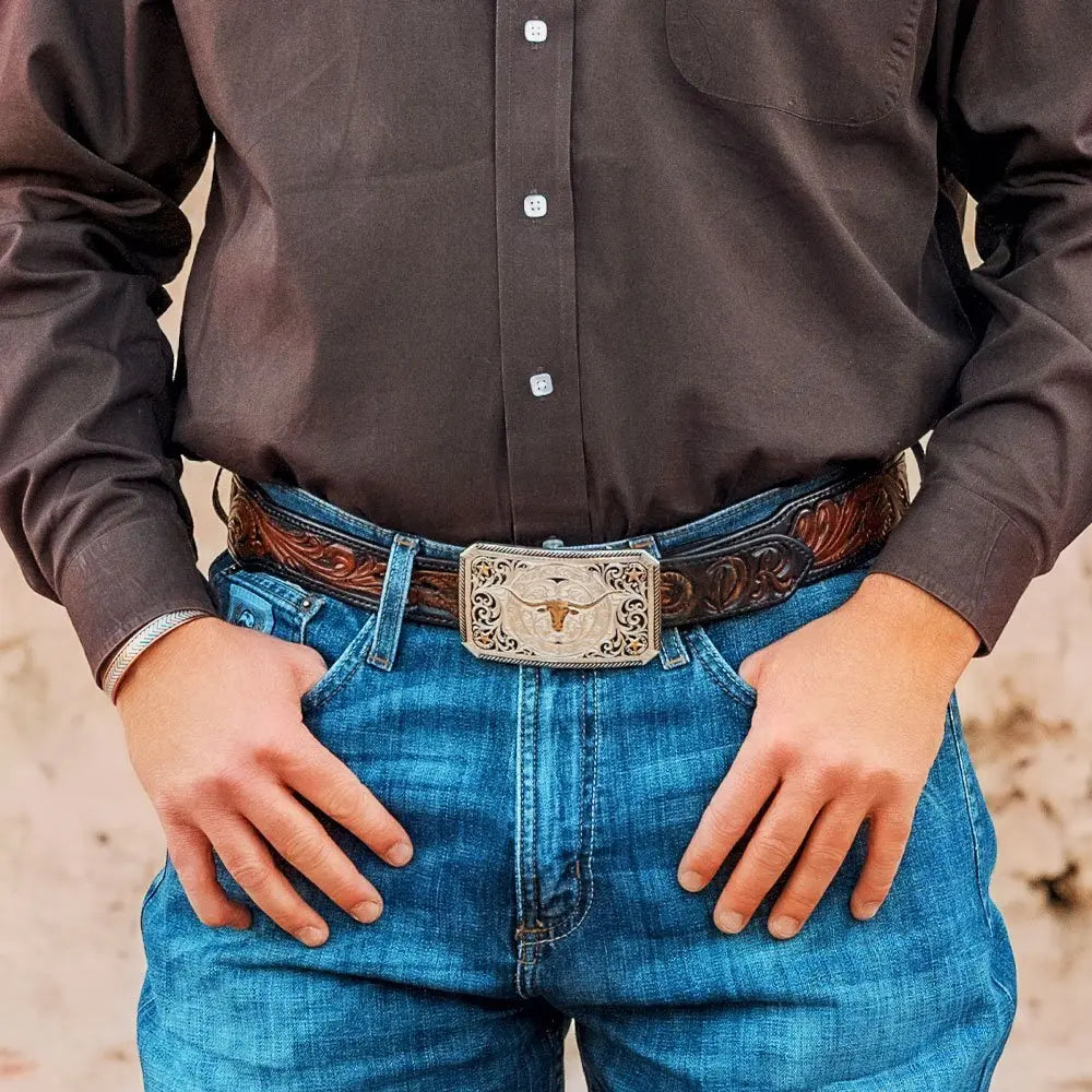 The Longhorn Cattle Drive Buckle will upgrade your outfit with a bold Western design. The silver tone square buckle features horseshoes and gold tone stars on each corner. In the center surrounded by silver tone engraving is an antiqued gold tone sculpted longhorn figure. More silver tone filigree covers the background that stands out from the black painted background. The buckle has a standard 1.5 inch swivel.